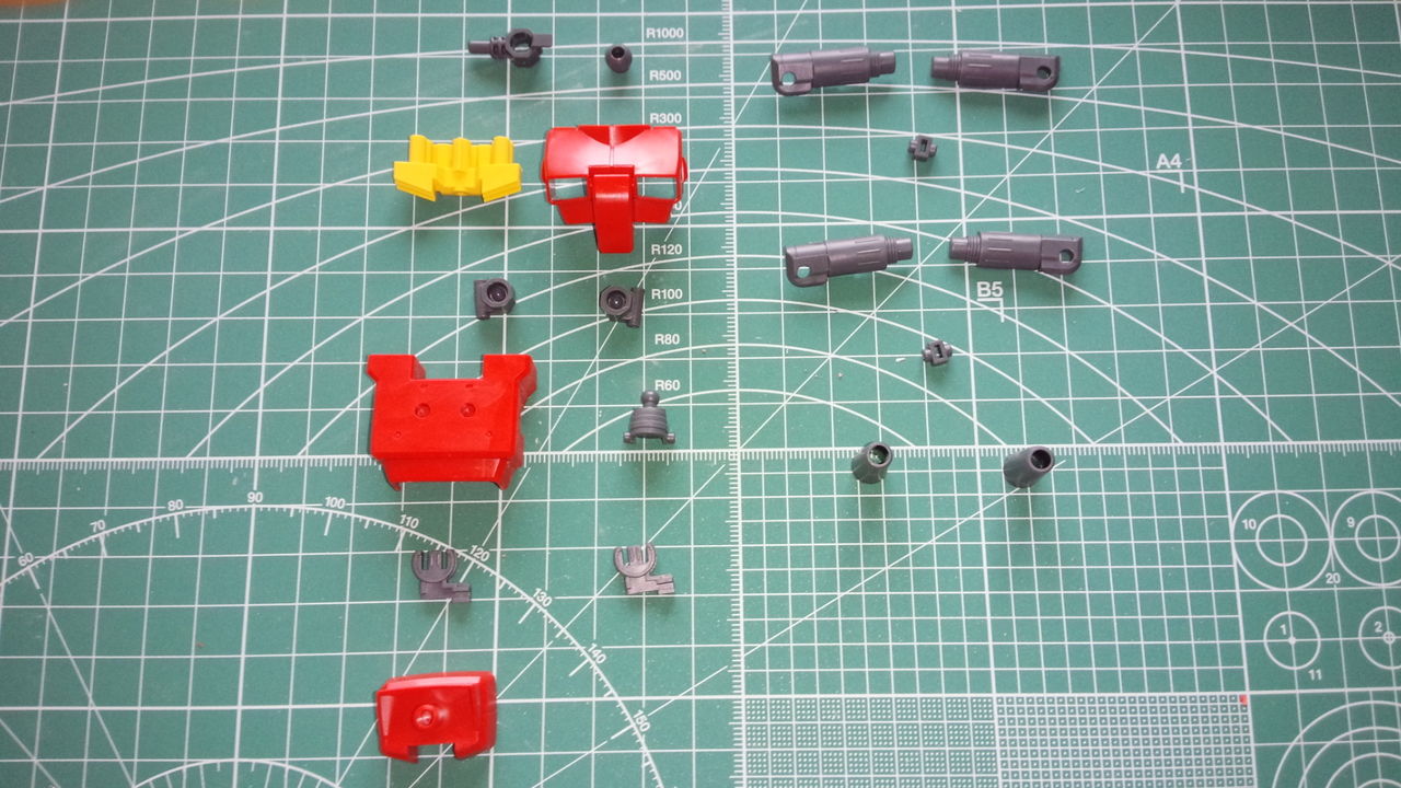 まずは、HGUC ガンキャノン REVIVEの腰部のパーツをランナーから切り出したところですが、ポリパーツを含めたグレー、赤、黄のパーツで構成されています。