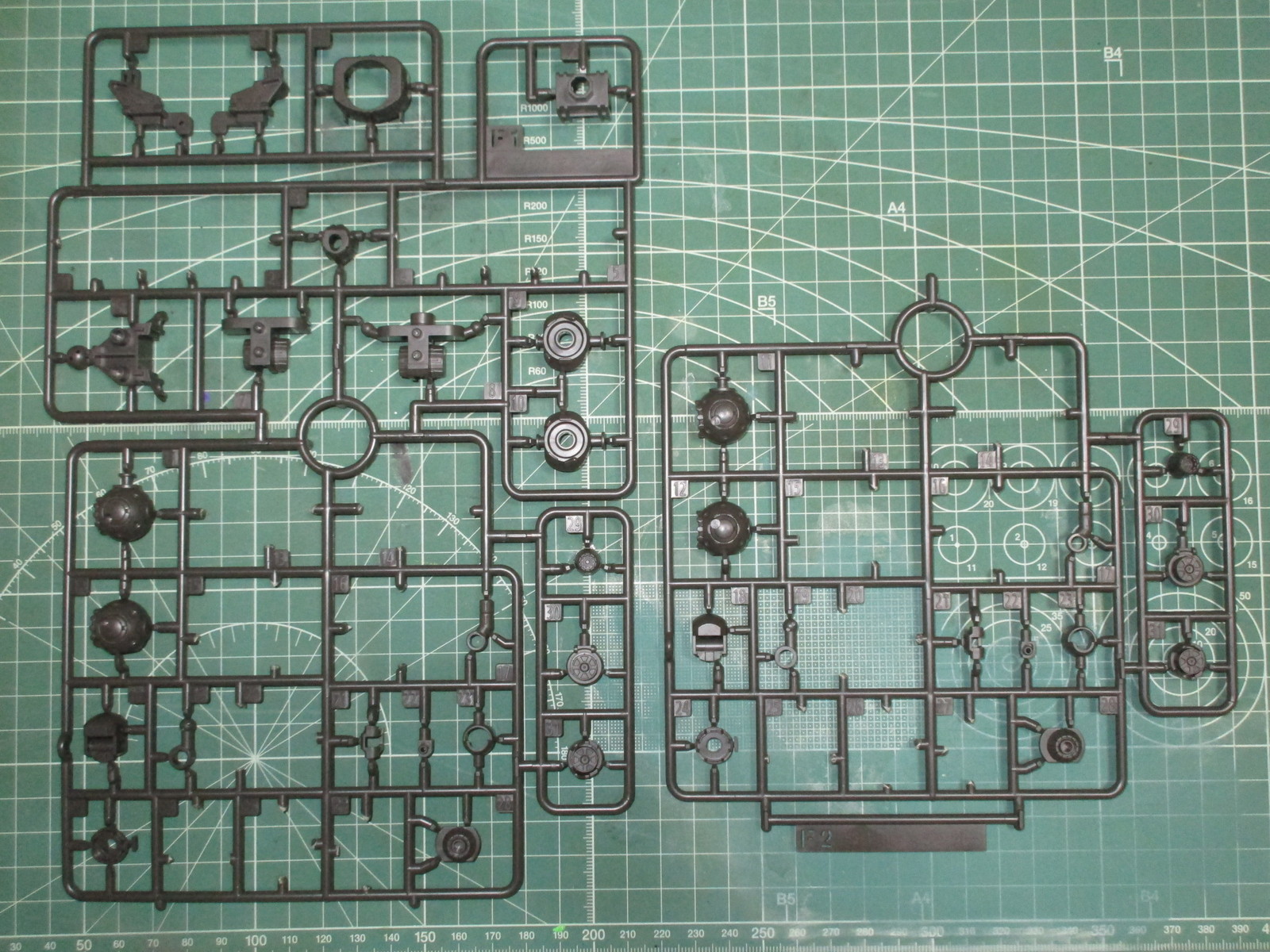次に、グレーのパーツで成形されているF1、F2ランナーでは、接続用のジョイント等のパーツを使用します。