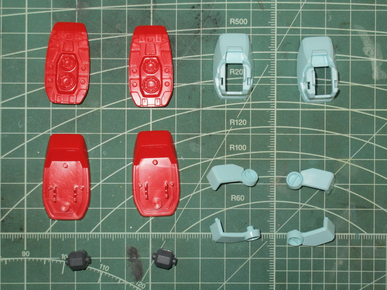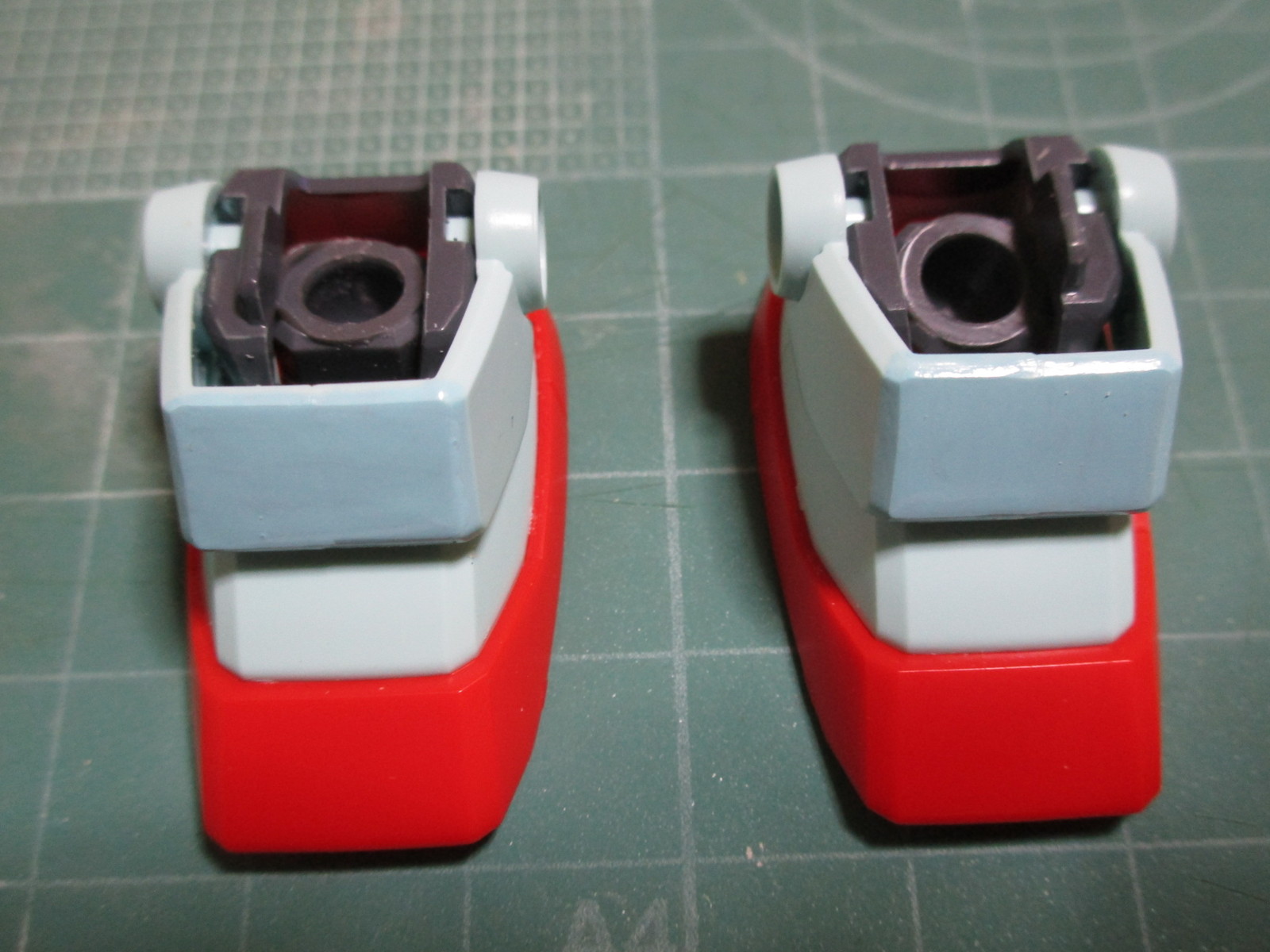 合わせ目消し後の塗装のついでに、アンクルアーマー側面にある丸いディテールや足のグレー部分も塗装しておきました。