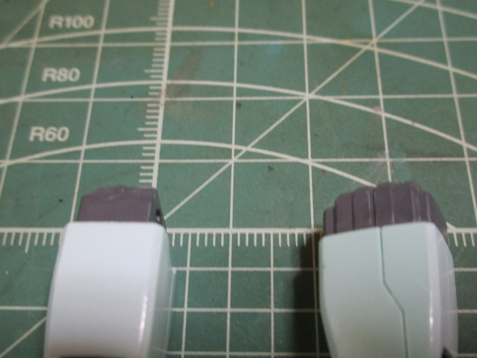 HGUC ジムの足は、アンクルアーマーに合わせ目が発生するので、タミヤセメントを使って合わせ目消しを行いました。