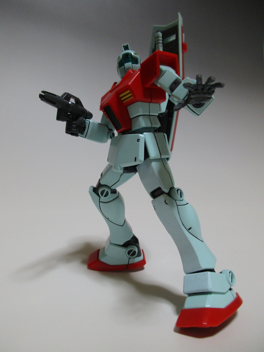 HGUC ジムには、左手専用ですが平手のマニピュレーターが付属しているので、表情豊かなアクションポーズも可能ですね(^_^)