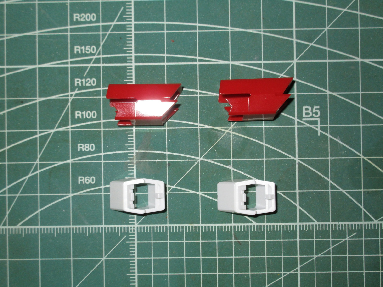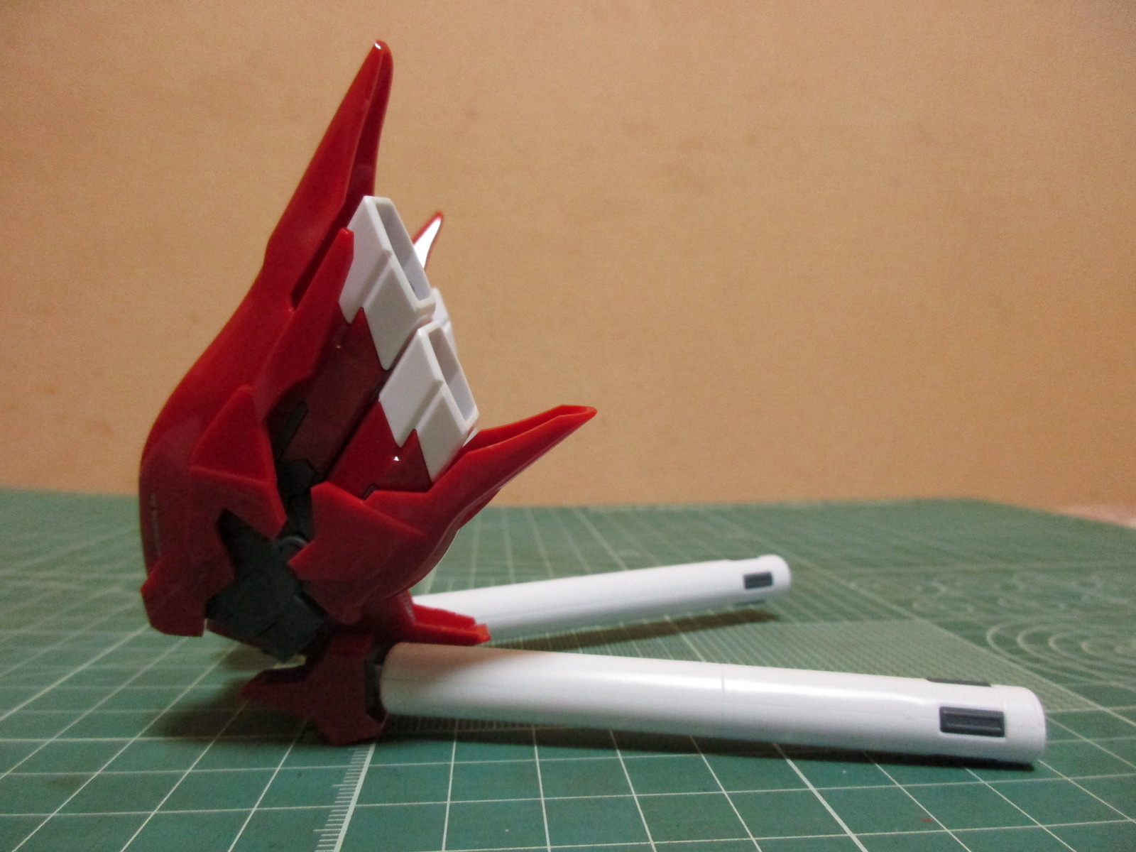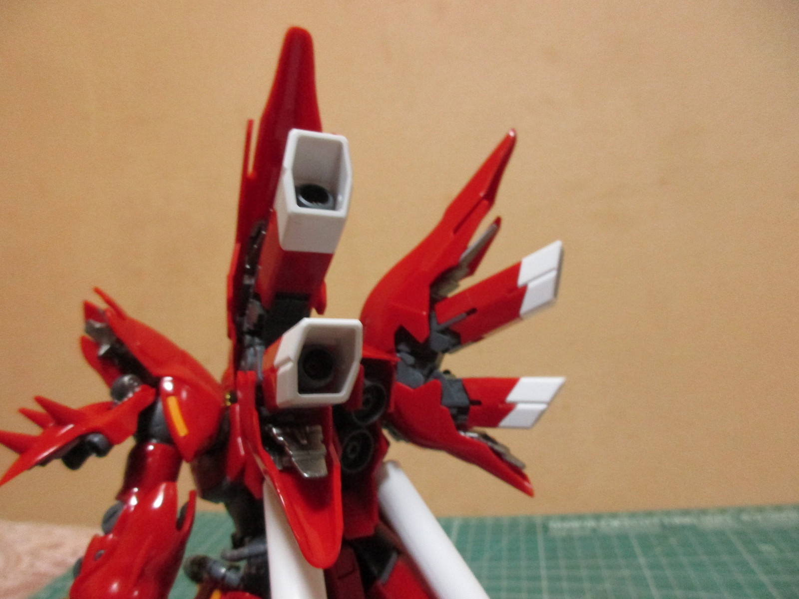 RG 1/144 シナンジュのバックパックの外装は、赤、白、グレーとシールで構成されています。