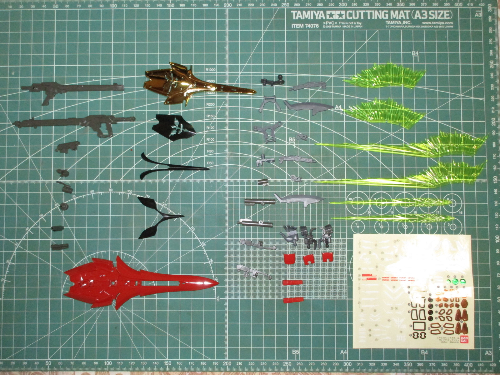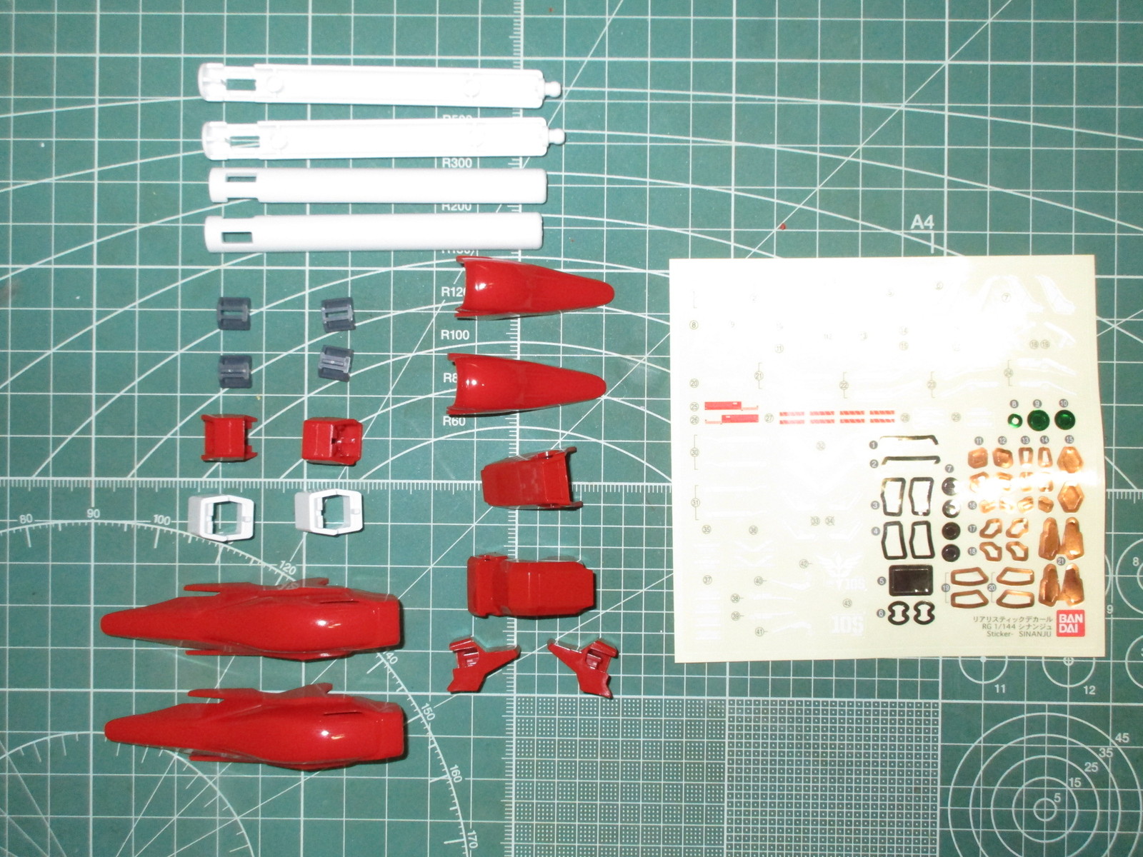 RG 1/144 シナンジュの武装は、グレー、赤、黒、ゴールド、緑のクリアパーツとシールで構成されています。