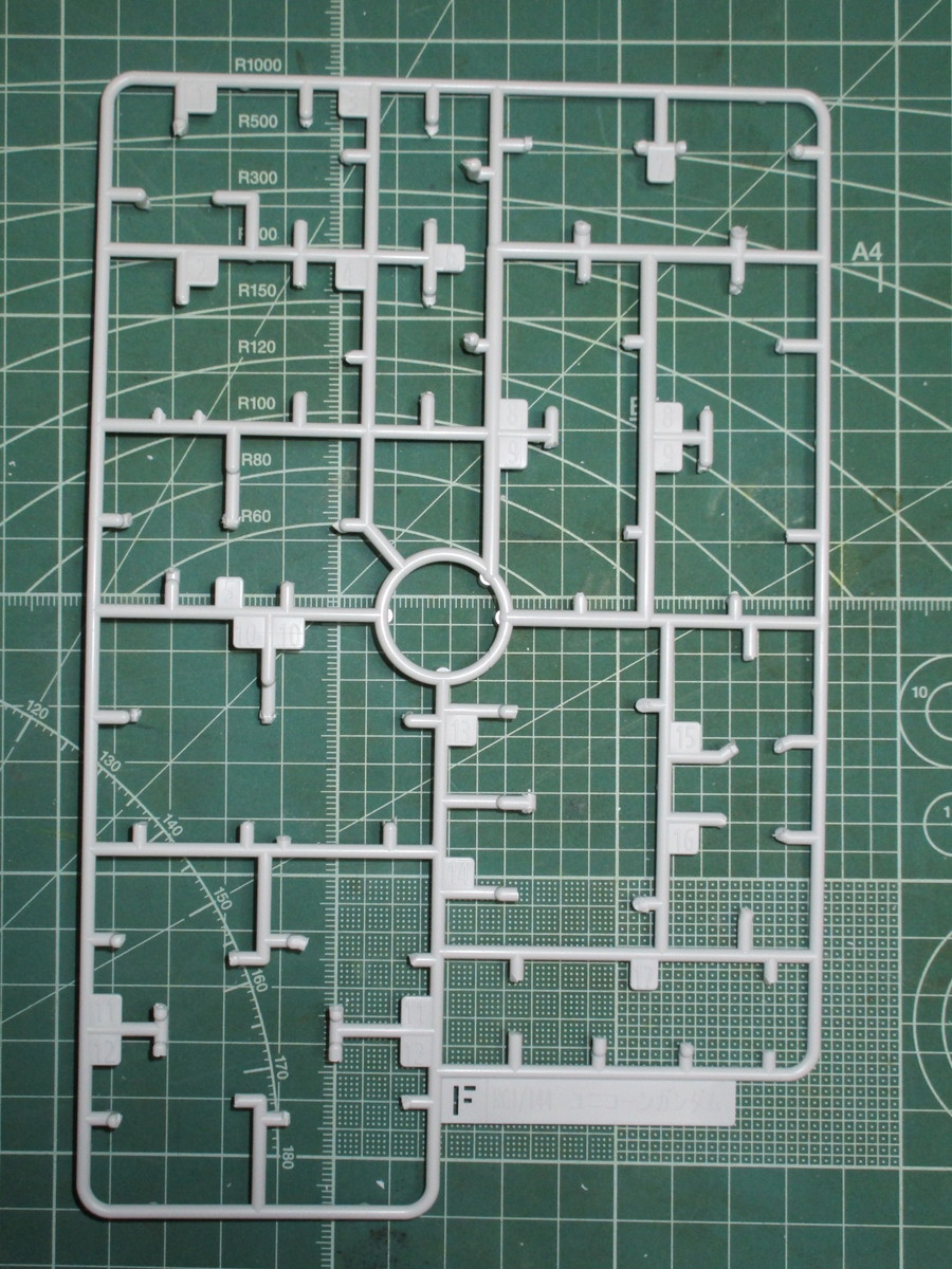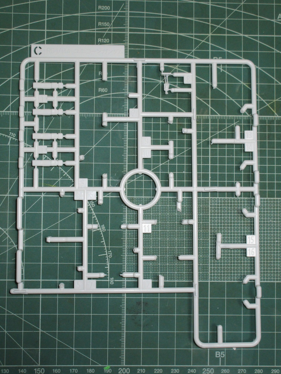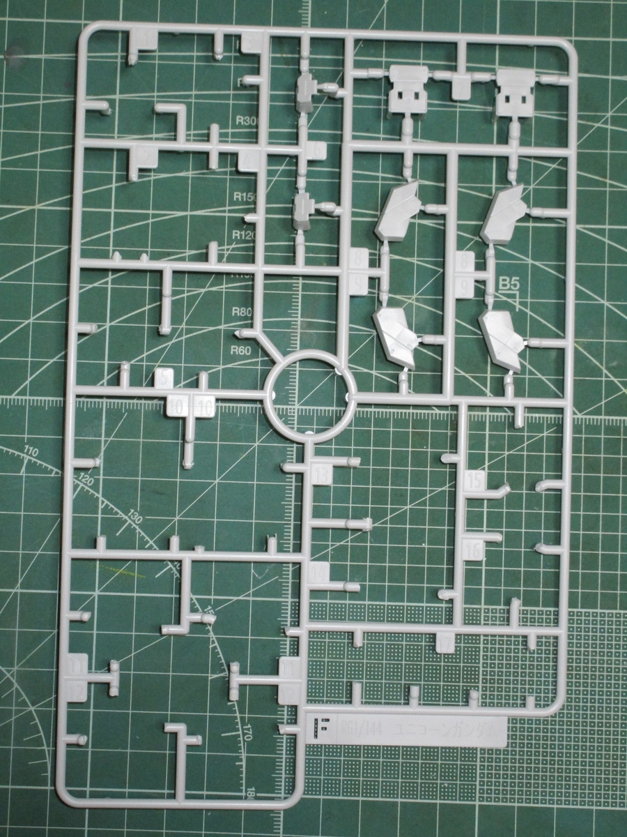 まずは上記で紹介したランナーから、RG ユニコーンガンダムの腕部と肩部の外装パーツを切り出したところです。