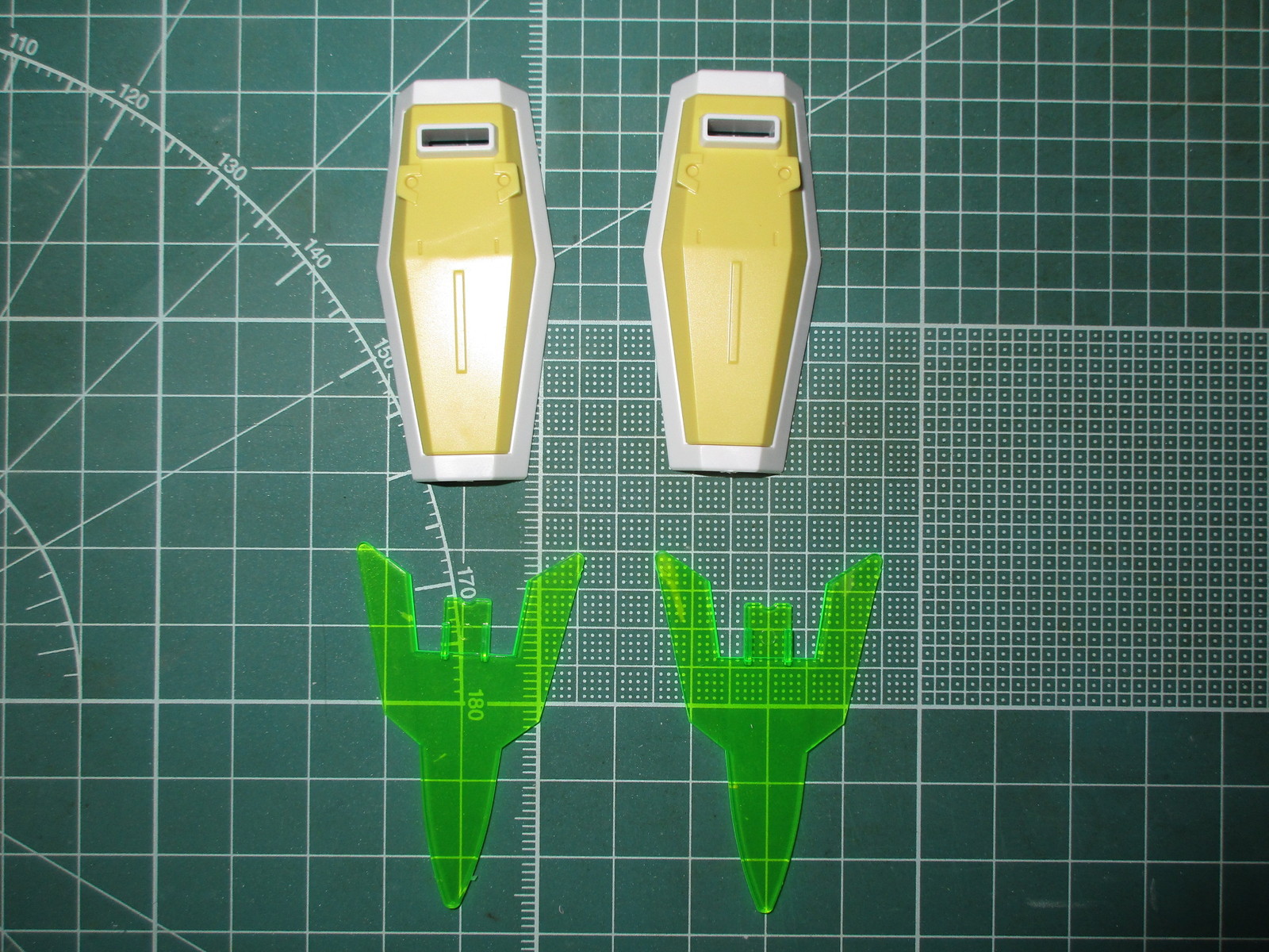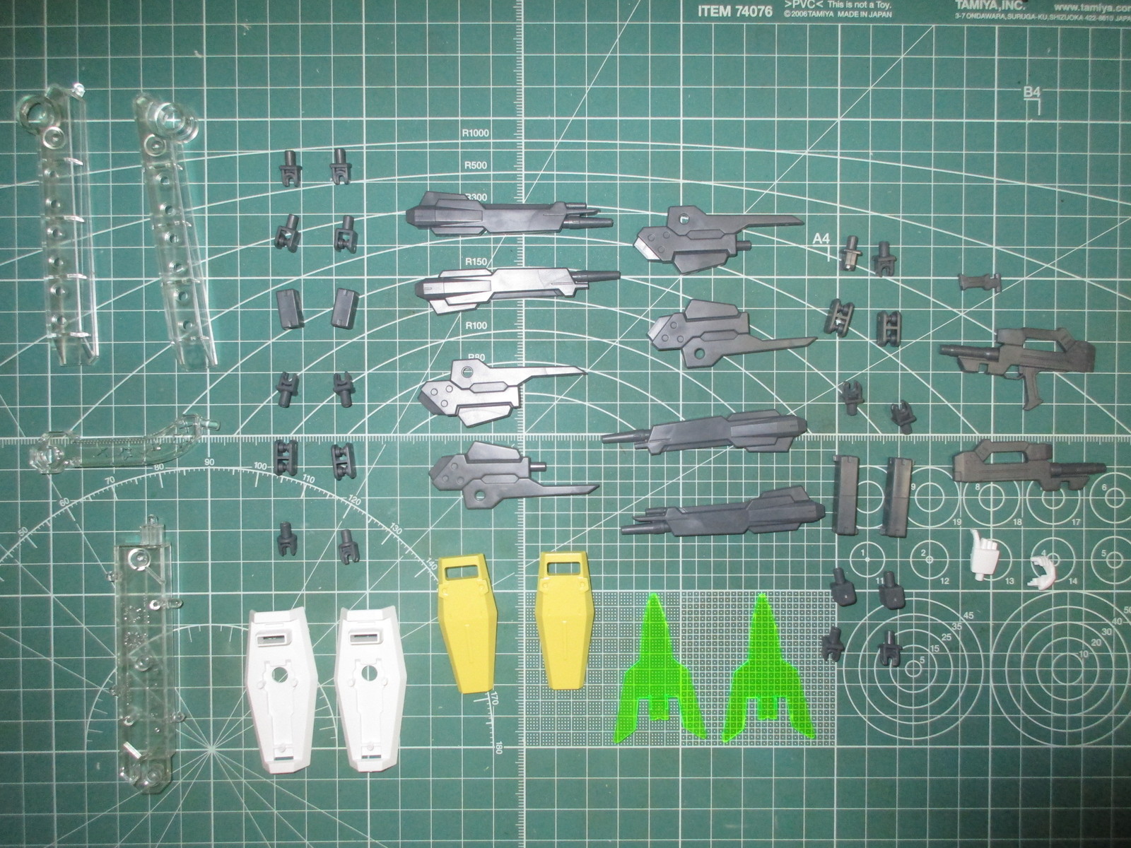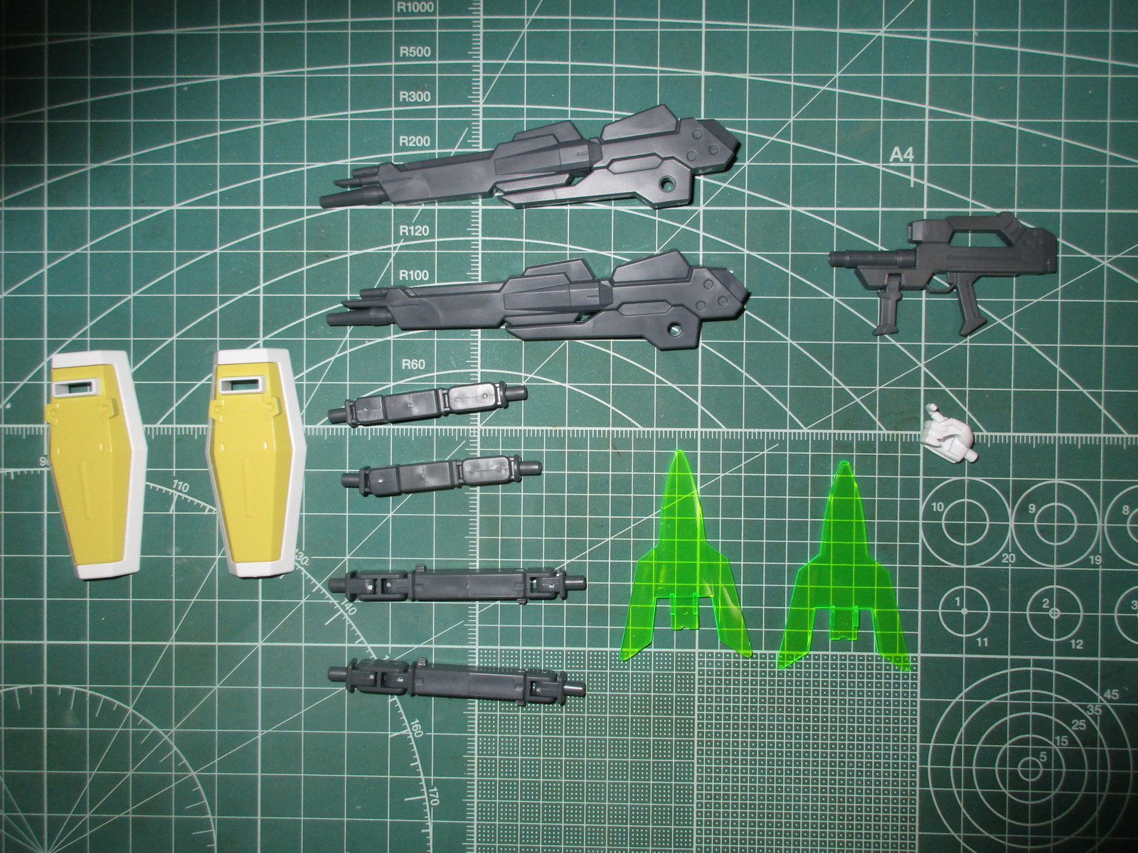 まずは、HGBF すーぱーふみなの武装類のパーツを切り出してみましたが、グレー、白、黄、透明のクリアパーツ、緑のクリアパーツで構成されています。