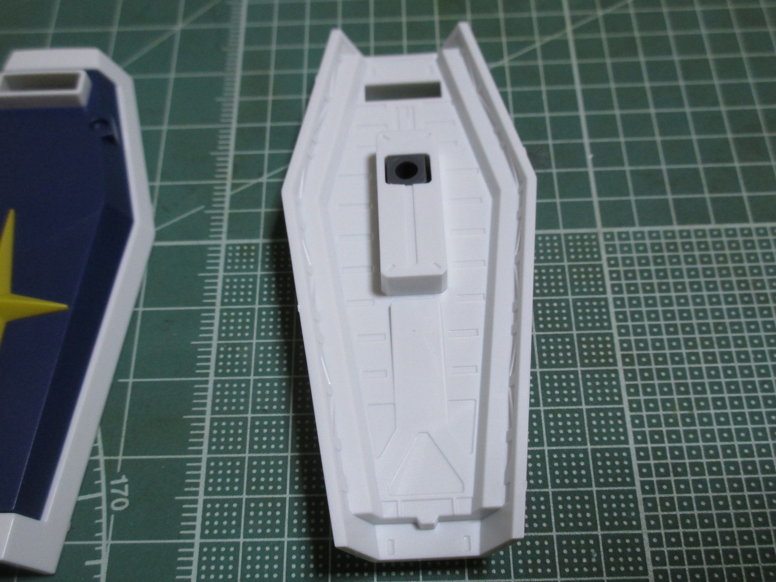 これは、バックパックに装備されているサブアーム展開用のパーツです。隣の白いパーツは、サブアームにシールドを持たせるための持ち手になっています。