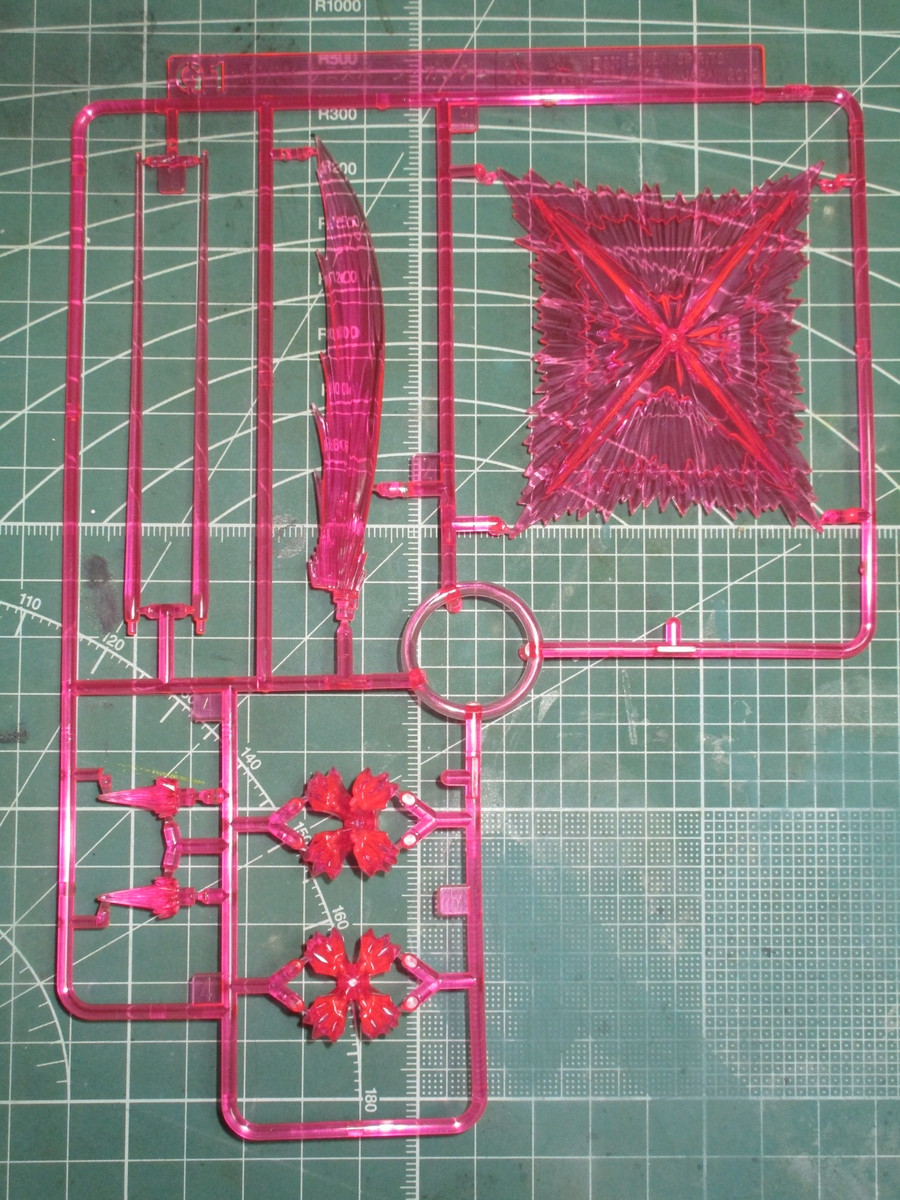 最後に、ピンクのクリアパーツで成形されているG1ランナーでは、ビーム・サーベル、ビーム・ザンバー、ブランド・マーカー、ビーム・シールドのパーツを使用します。